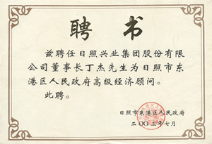 · 2003年7月,茲聘任丁杰董事長(zhǎng)為日照市東港區(qū)人民政府高級(jí)經(jīng)濟(jì)顧問