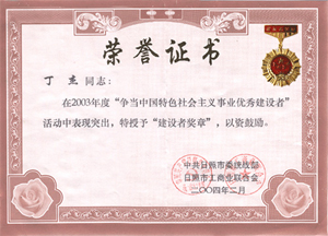 · 2004年2月,授予丁杰董事長(zhǎng)“爭(zhēng)當(dāng)中國特色社會(huì)主義事業(yè)優(yōu)秀建設(shè)者”