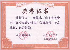 · 2005年12月,丁杰董事長(zhǎng)榮獲“山東省關(guān)愛員工優(yōu)秀民營(yíng)企業(yè)家”榮譽(yù)稱號(hào)