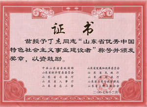 · 2007年12月,丁杰董事長(zhǎng)榮獲“山東省優(yōu)秀中國特色社會(huì)主義事業(yè)建設(shè)者”榮譽(yù)稱號(hào)