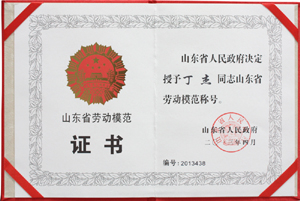 ·2013年4月,山東省人民政府授予丁杰董事長(zhǎng)“山東省勞動(dòng)模范”稱號(hào)