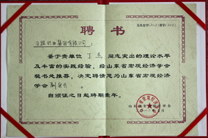 ·2012年5月,山東省宏觀經(jīng)濟(jì)學(xué)會(huì)聘請(qǐng)丁杰董事長(zhǎng)為“山東省宏觀經(jīng)濟(jì)學(xué)會(huì)副會(huì)長(zhǎng)”
