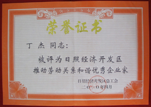 · 2010年4月,丁杰董事長(zhǎng)榮獲“日照經(jīng)濟(jì)開發(fā)區(qū)推動(dòng)勞動(dòng)關(guān)系和諧優(yōu)秀企業(yè)家”榮譽(yù)稱號(hào)