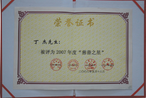 · 2008年5月,丁杰董事長(zhǎng)榮獲“2007年度慈善之星”榮譽(yù)稱號(hào)