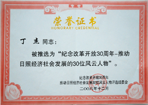 · 2008年12月,丁杰董事長(zhǎng)被評(píng)為“紀(jì)念改革開放30周年風(fēng)云人物-推動(dòng)日照社會(huì)經(jīng)濟(jì)發(fā)展的30位風(fēng)云人物”