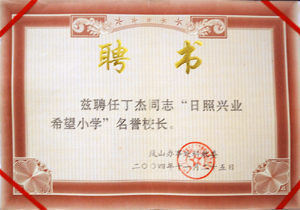 · 2004年11月,茲聘丁杰董事長(zhǎng)為“日照希望小學(xué)榮譽(yù)校長(zhǎng)”