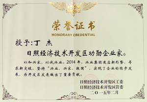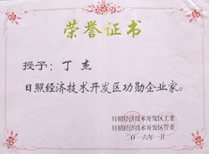 ·2015年2月,日照經(jīng)濟(jì)技術(shù)開發(fā)區(qū)授予丁杰董事長(zhǎng)“日照經(jīng)濟(jì)技術(shù)開發(fā)區(qū)功勛企業(yè)家”稱號(hào)。