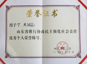 ·2015年12月,山東省總工會(huì)授予丁杰董事長(zhǎng)“山東省推行協(xié)商民主強(qiáng)化社會(huì)責(zé)任優(yōu)秀個(gè)人”榮譽(yù)稱號(hào)。