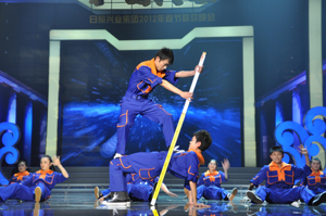 STAR》,引起全場雷動歡呼;同德礦業(yè)公司選送的雜技《肩上芭蕾》驚險(xiǎn)刺激,來自北京雜技團(tuán)的年輕演員們在同伴肩膀上邁起輕盈的舞步,場下觀眾驚呼不已,拍手叫絕;臨汾志強(qiáng)鋼鐵公司的漢子們表演的威風(fēng)鑼鼓《堯天舜日》高亢激昂,令觀眾們心潮澎湃,更激發(fā)了大家開創(chuàng)美好未來的激情和斗志。